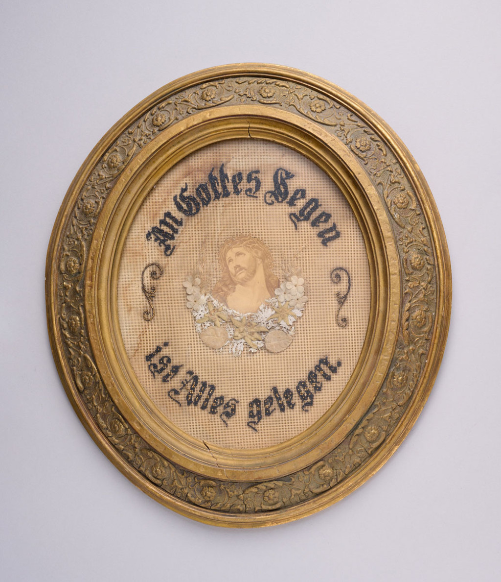XIX. század vége, faragott keretben, hímzett, papír díszítéssel, kopott, sérült, M: 41 x 36 cm