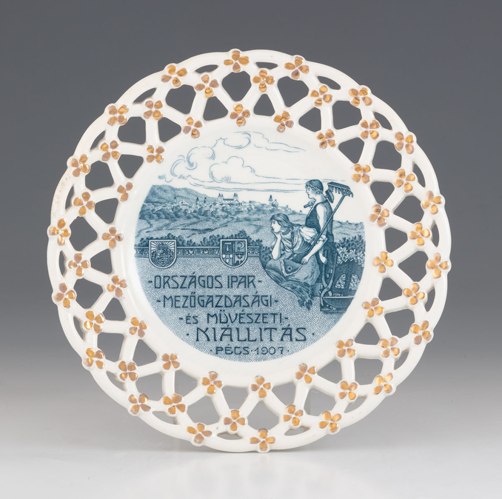 Fajansz. Öblében matricázott dekor, peremén áttört motívumok közt aranyozott virágok. Az 1907-es pécsi Országos ipar- mezőgazdasági- és művészeti kiállításra készített darab. Alján jelzett: Zsolnay Pécs, formába nyomott 7445 (formaszám). Kisebb javításokkal. Átm.: 19,5 cm