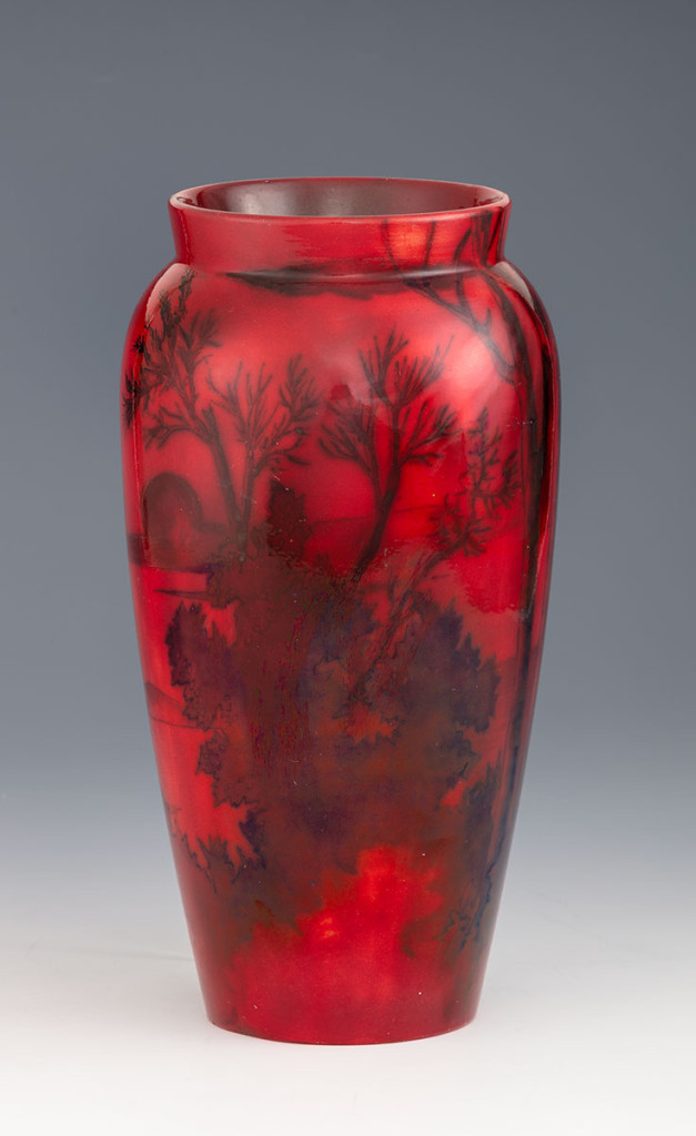 Korongozott fehércserép. Felületén fényes, transzparens piros eozinmáz alatt kobalttal rajzolt romantikus tájkép. Dekorterv: 2960 (1898-1899). Alján jelzett: masszába nyomott 5650 (1899. évi formaszám) és 36, valamint alapmázzal megegyező, kerek, domborodó, pecsétszerű márkajelzés. Restaurált. Zsolnay, Pécs, 1904 körül. M.: 33,5 cm
