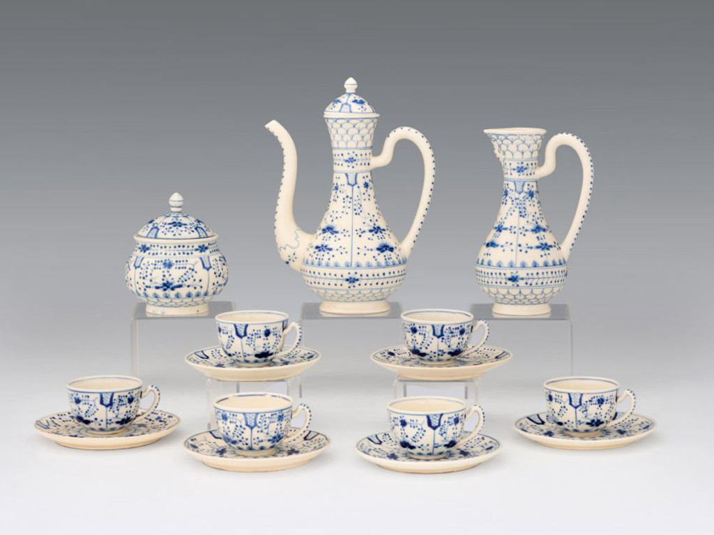 Mokkáskanna, tejkiöntő, cukortartó és 6 db mokkáscsésze aljjal. Porcelánfajansz, felületükön magastüzű kobaltkék ún. vieaux saxe dekorral. 2 db csészealj peremén csorbult. Alján jelzett: masszába nyomott Zsolnay Pécs és 520 (formaszám), valamint máz alatt kékkel bélyegzett családi jegy. Zsolnay, Pécs, 1882. Mokkáskanna m.: 23,5 cm, tejkiöntő m.: 18,5 cm, cukortartó m.: 12 cm, csésze m.: 4,5 cm, alj átm.: 12,8 cm