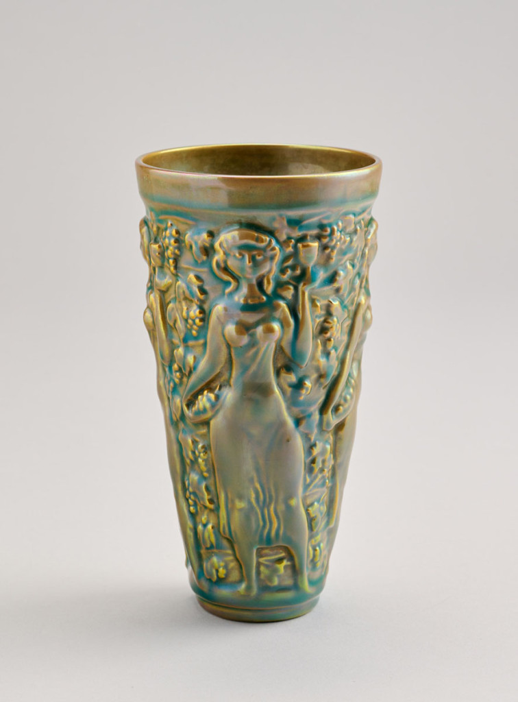 Zsolnay szüretelő pohár, színes eozinnal festett porcelán, Pécs, XX. század második fele, M: 16,5 cm
