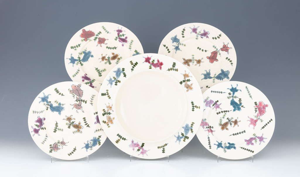 Porcelánfajansz. 4 db süteményestányér köretes tállal. Elefántcsontszínű alapmázon magastüzű, színes mázakkal és kobalttal kontúrrajzolt koi pontyok ábrázolása. Egyik tányér talpperemén kis csorba. Jelzett: masszába nyomott Zsolnay Pécs, 431 és 595 (formaszámok), valamint máz alatti kobaltkék családi márkajegy. Zsolnay, Pécs, 1880-as évek. Átm.: 21,5 és 27,5 cm