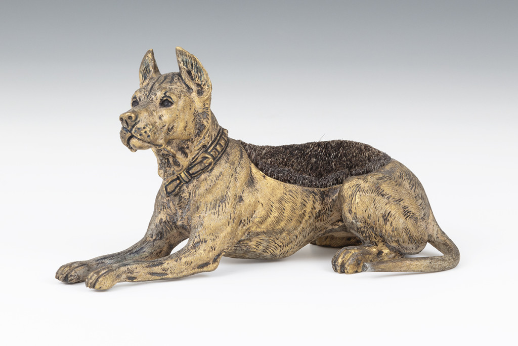 Öntött, hidegen festett és vésett bronz. Kutya hátán vaddisznó sörtéjéből készült tűpárna. Alján Gesütz beütővel. Ausztria, 1900 körül. M.: 16,5 × 10 cm