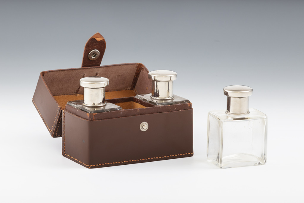 Három részes parfümös készlet, eredeti bőr tokjában. Csiszolt üveg, ezüstözött fém dugóval. Palack m.: 9 × 6 × 4 cm