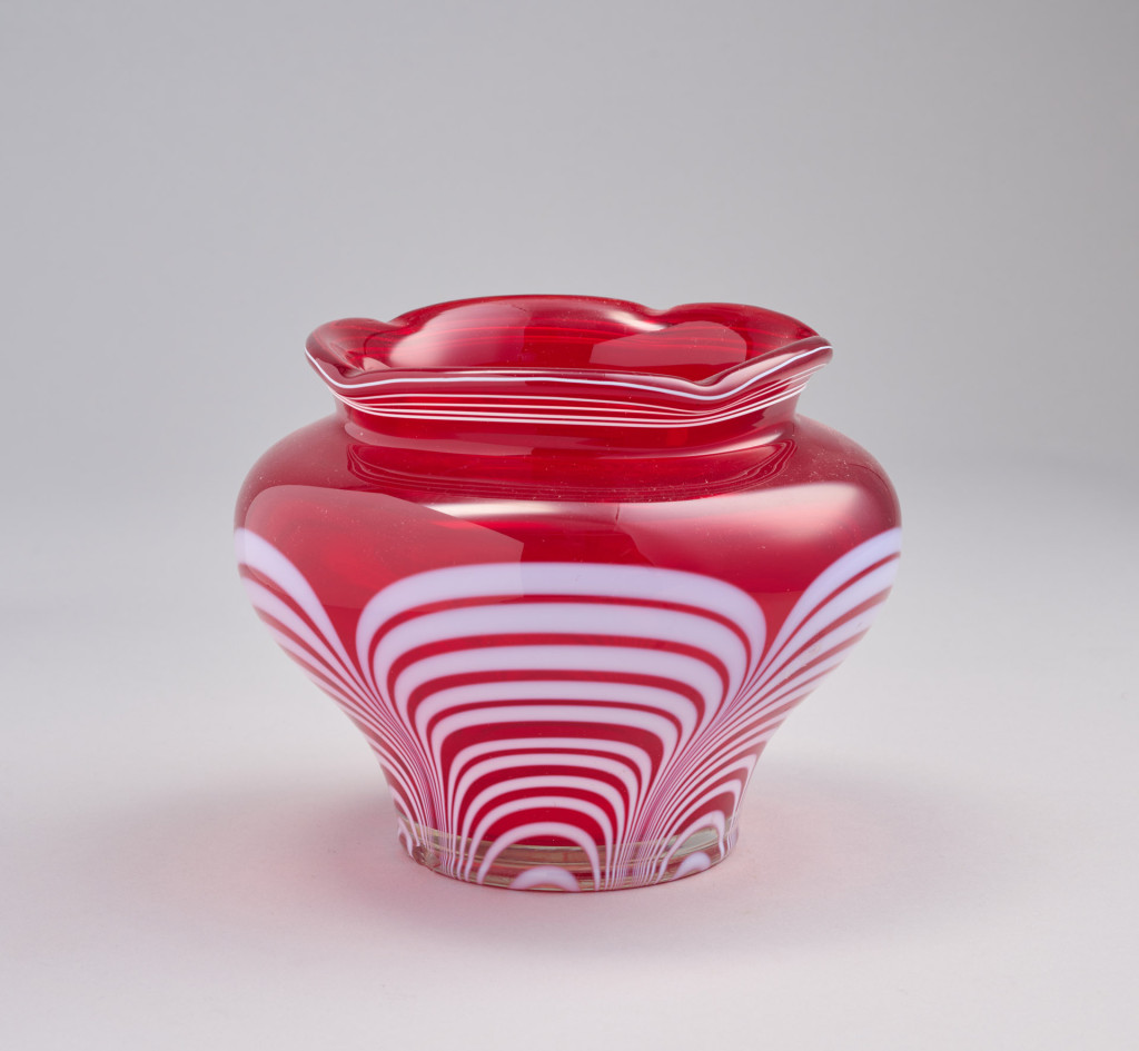 Fúvott, piros üveg fehér száldíszítéssel. Designer: Anatoly Fedorkov. Belarusz, XX. század második fele, Neman üveggyár. M: 12 cm