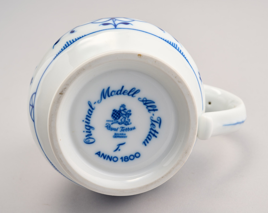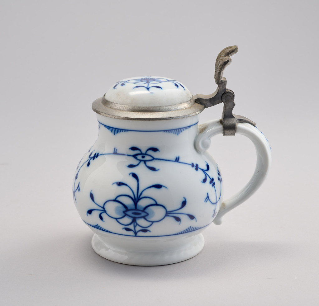 Máz alatti kobaltkékkel festett fedeles porcelánkupa ón szerelékekkel. Az 1800. évi Alt-Tettau modell mása. Német, 1970-es évek, Royal Tettau. M.: 17 cm